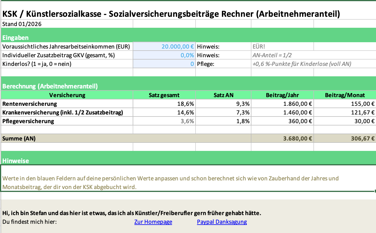 Diese Tabelle ist ein einfacher Rechner für deine KSK-Sozialversicherungsbeiträge.